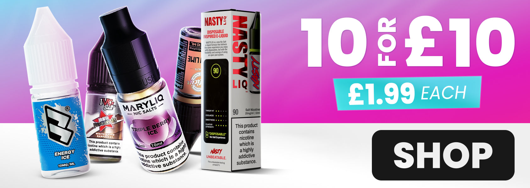 With over 250 e-liquids available on our website in a huge range of flavours, we're here to help you find your next all-day vape. From shortfills to 10ml MTL liquids, pods, nic salts, shots and more, our TPD compliant e-liquids are handpicked from the world's leading manufacturers with big brands like Nasty Juice, IVG, Dinner Lady and Riot Squad - plus our very own, much-loved Pure E-Liquid!